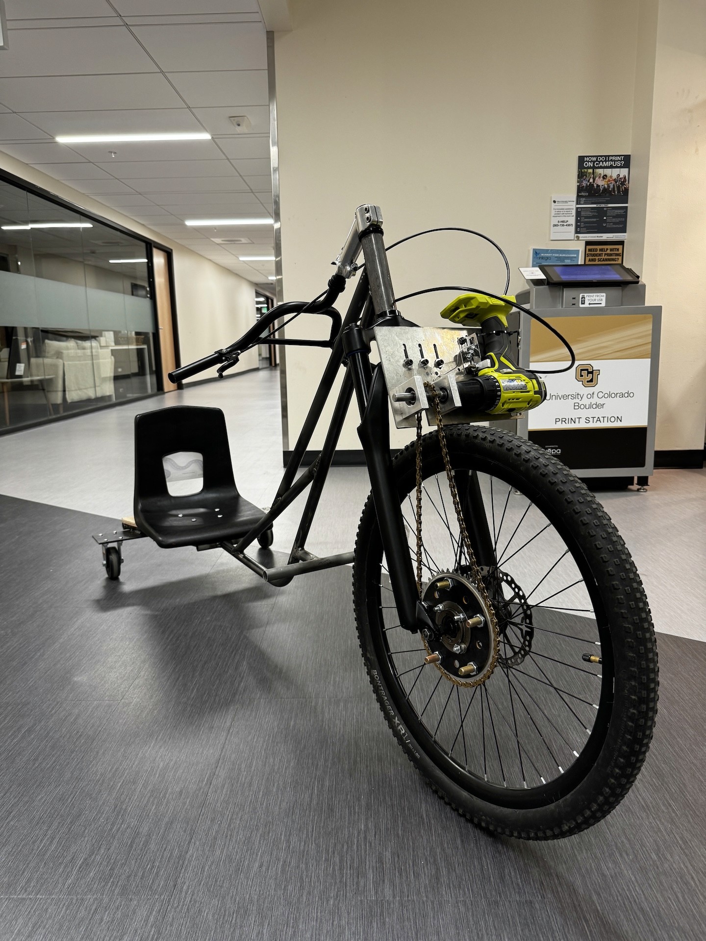 Our bike featured a large driven front wheel, harvested from a fat tire bike, along with 2 rear caster wheels for stability and drifting capabilities. The bike utilized a Ryobi brushed drill to drive the front wheel using a chain with adjustable tensioner. The custom drill plate houses both the drill and the throttle mechanism. The entire frame is custom and was cut, coped, and welded by my team.